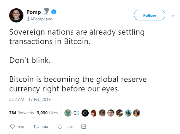 Người sáng lập & Đối tác tại Morgan Creek Digital là Anthony Pompliano gần đây đã đăng lên Twitter của mình về sự phát triển mới này và anh nói rằng Bitcoin thực sự là một loại tiền tệ dự trữ toàn cầu ngay trước mắt chúng ta.