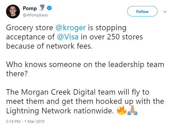Đối tác của Morgan Creek Digital, người đam mê Bitcoin và là người dẫn chương trình podcast nổi tiếng Anthony Pompliano đã làm cho cộng đồng ủng hộ BTC sục sôi khi ông nói rằng nhóm của ông sẵn sàng bay đến gặp lãnh đạo của Kroger để thảo luận về việc sử dụng Bitcoin hỗ trợ Lightning như một sự thay thế với mức phí thấp hơn Visa.