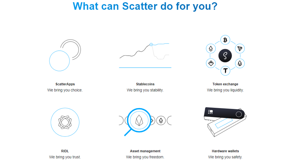 Scatter Chrome extension trở thành plug-in và cũng là ví EOS được sử dụng rộng rãi, với tổng số người dùng lên đến 20,000 chỉ trong vòng một tuần sau mainnet. Điều đặc biệt ở Scatter giúp ví này nhận được sự yêu thích từ cộng đồng EOS chính là sự kết nối với hàng chục các ứng dụng và dịch vụ khác của EOS, cho phép người dùng đăng nhập, giao dịch và lưu trữ thông tin cực kỳ tiện lợi, nhanh chóng mà không cần nhập private key, giảm khả năng bị hack hoặc lộ thông tin.