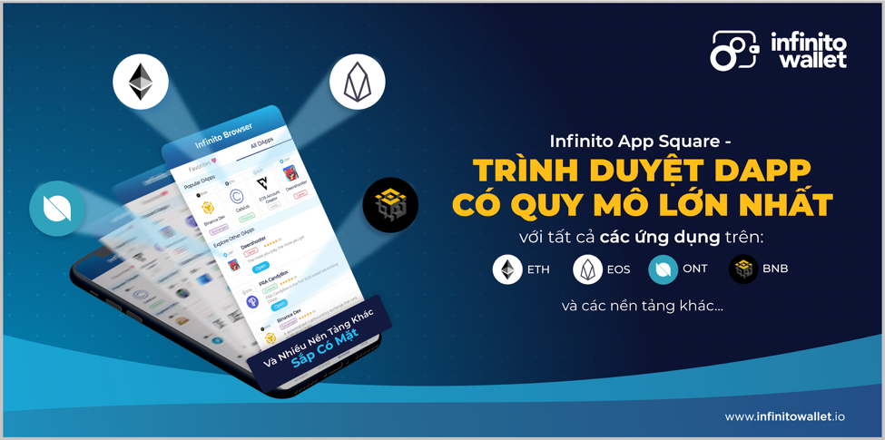 Đầu năm 2019, Ví Infinito ra mắt App Square – Trình duyệt DApp (DApp Browser) tích hợp ngay bên trong ứng dụng di động của mình. Chỉ trong vài tháng, con số blockchain mà App Square hỗ trợ tăng rất nhanh: từ Ethereum, EOS đến ONTology, Binance Chain và sắp tới, theo tin tức từ trang chủ của Infinito Wallet, sẽ là NEO, TRON và STELLA.