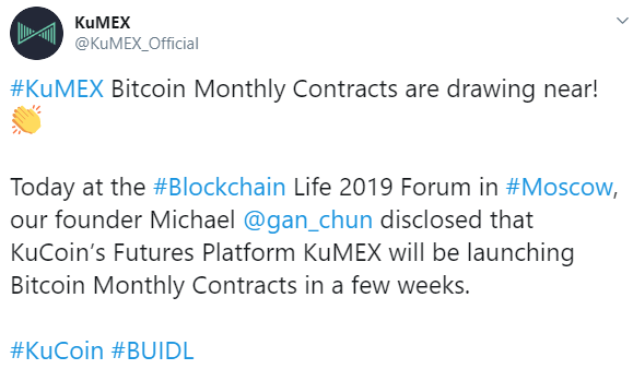 Một thông báo trên tài khoản Twitter chính thức của KuMEX, nền tảng tương lai của sàn giao dịch Kucoin tiết lộ rằng các hợp đồng Bitcoin hàng tháng sẽ sớm ra mắt trên nền tảng này.