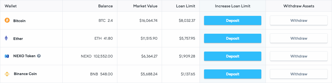 Nhấp vào “Deposit” và nhập số tiền muốn gửi. Bạn có thể tăng Hạn mức cho vay bằng cách nạp thêm Coin vào Ví Nexo của mình bất kỳ lúc nào mà bạn muốn.