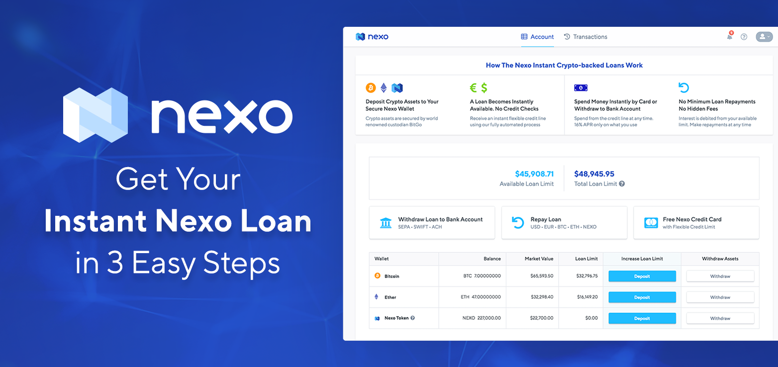 Nexo cung cấp cho chủ sở hữu tiền mã hóa (như Bitcoin, ETH, BNB, Nexo,…) giải pháp cho vay bằng thế chấp tài sản tiền điện tử của họ thay vì phải bán chúng đi khi họ cần vay tiền mặt gấp.
